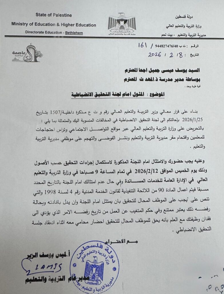 بخصوص استدعاء الناشط النقابي يوسف اجحا للمثول أمام لجنة تحقيق انضباطية في وزارة التربية والتعليم في بيت لحم